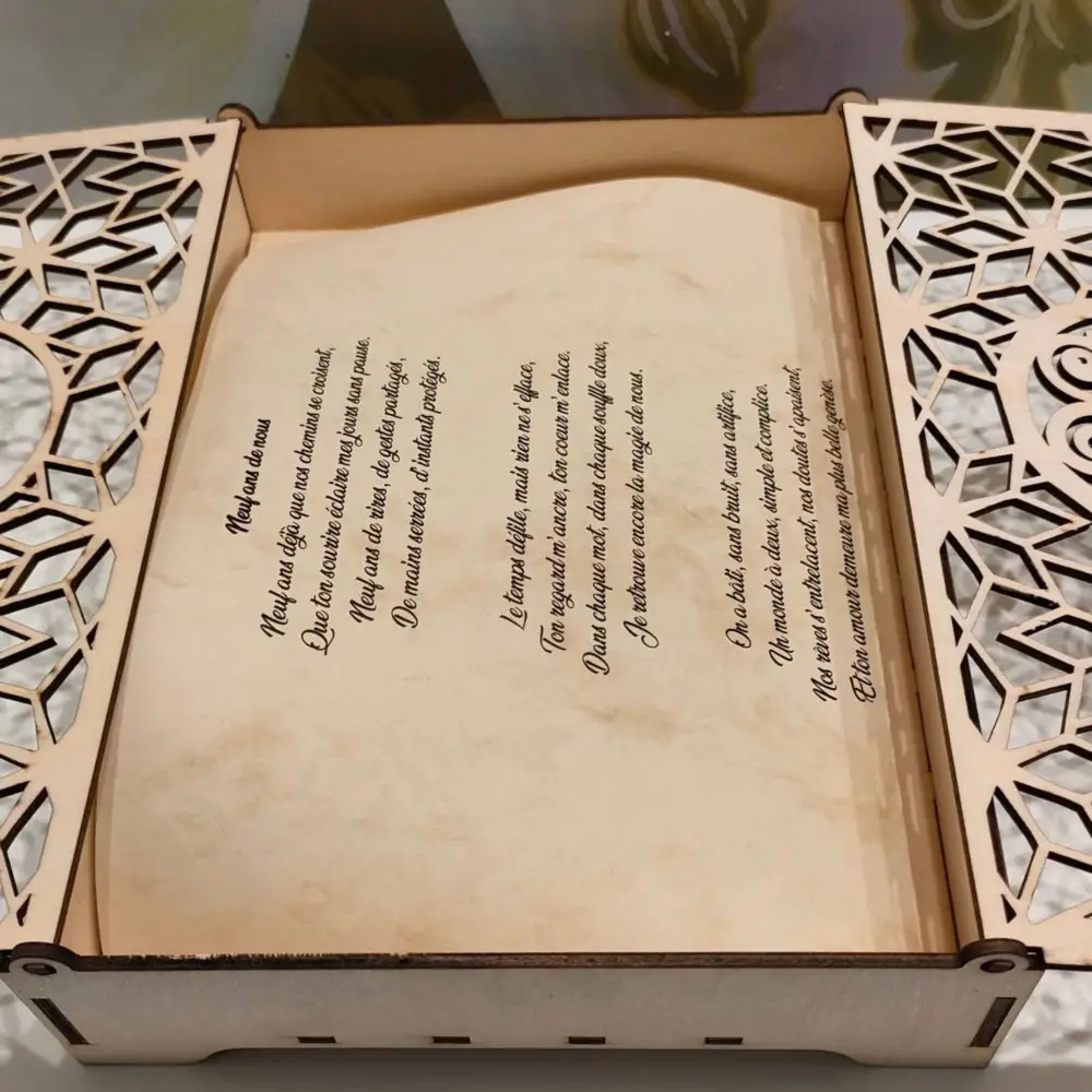 Ce coffret, fabriquée et gravée avec soin dans mon atelier, a été pensée pour accueillir un poème personnalisé, imprimé sur un papier style parchemin de qualité, puis délicatement glissé à l’intérieur et il y a même encore de la place pour y glisser une rose ou un petit présent