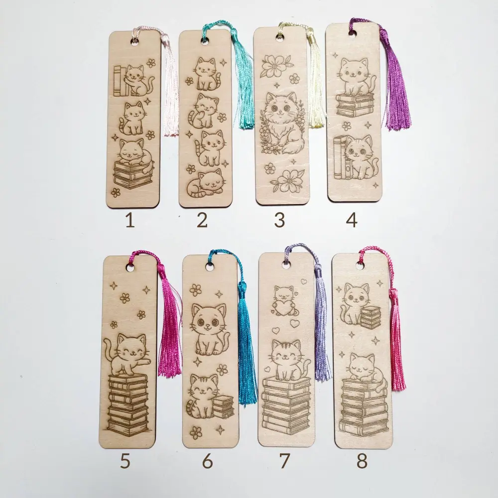Ajoutez une touche de douceur et de fantaisie aux moments de lecture avec ces marque-pages en bois gravés au laser représentant d’adorables petits chats.