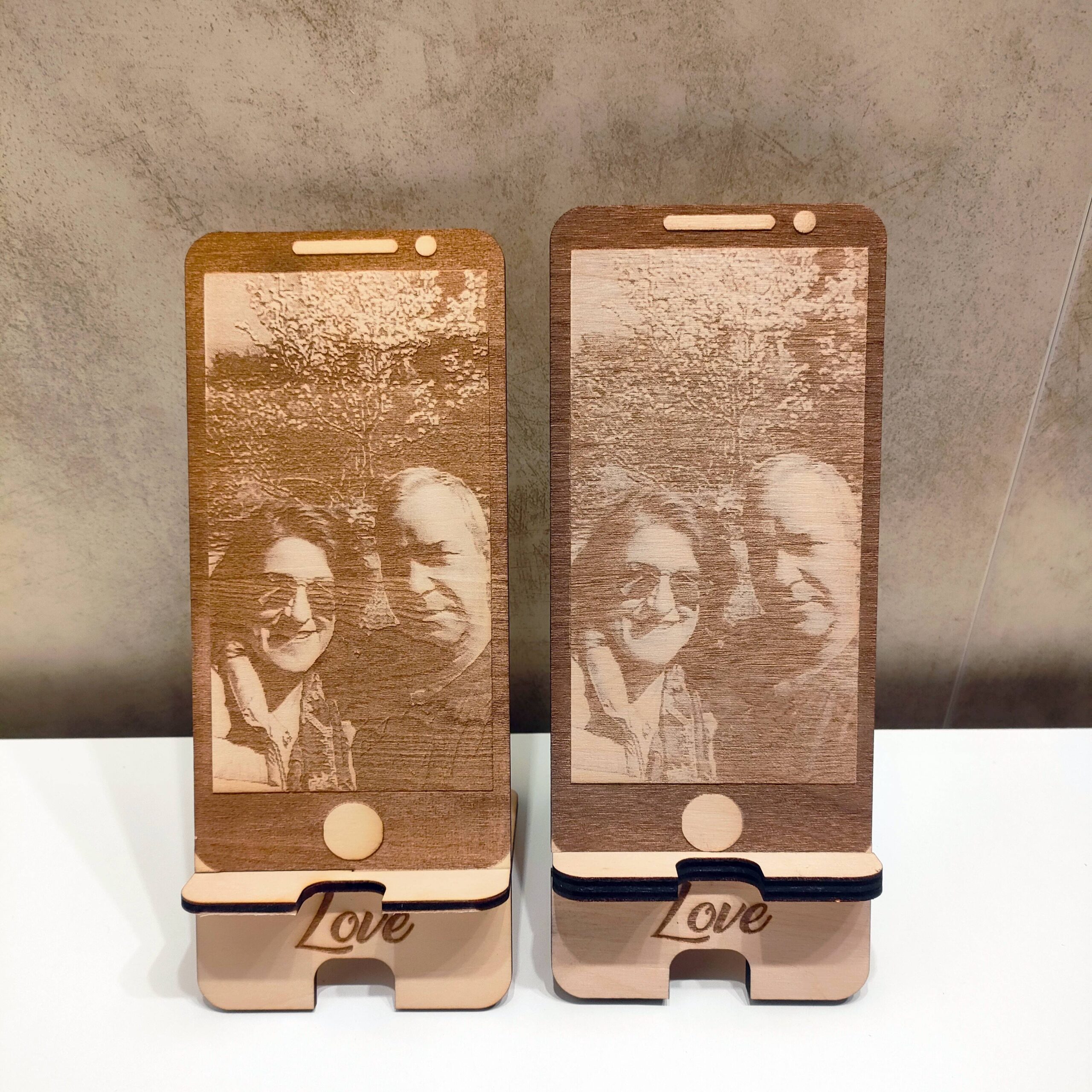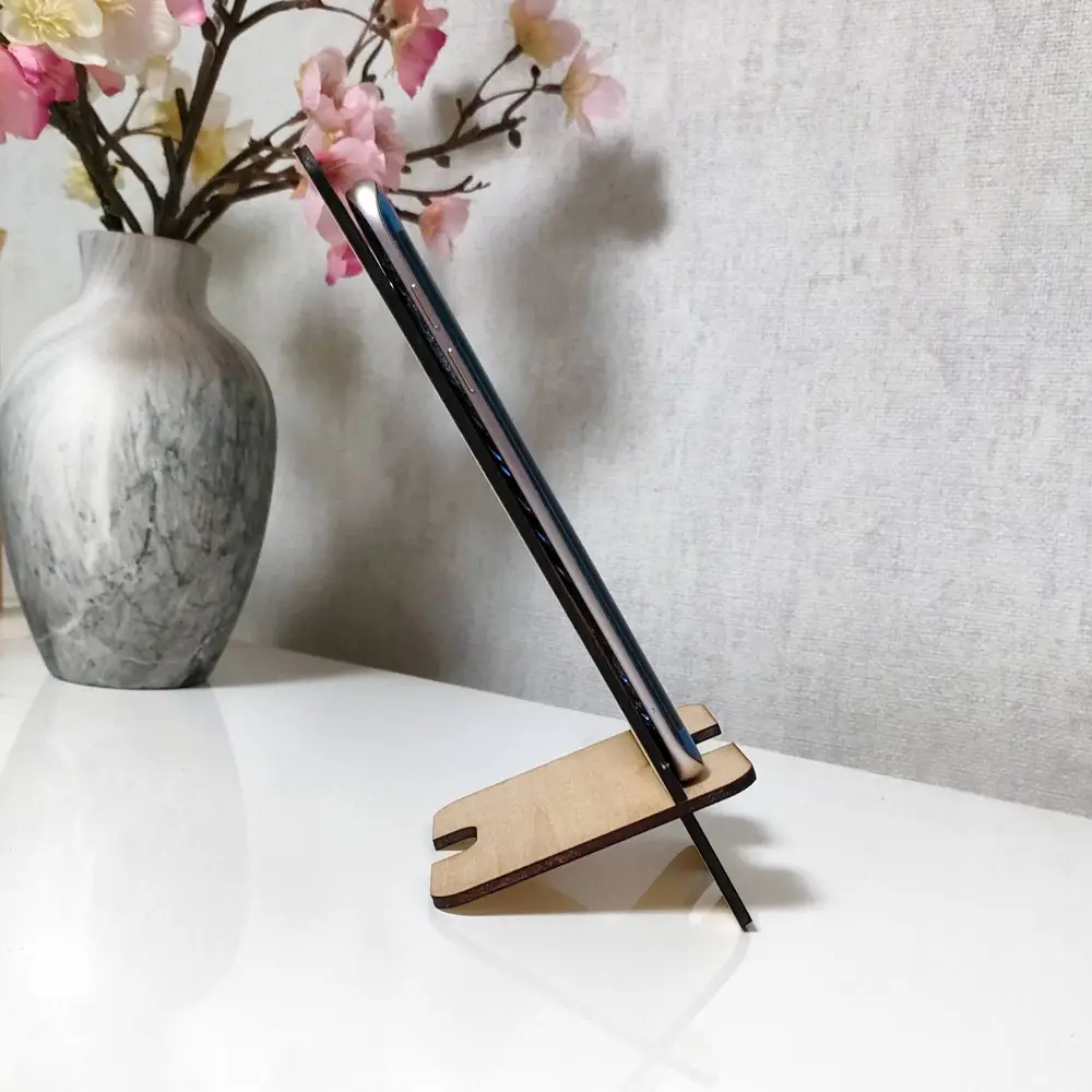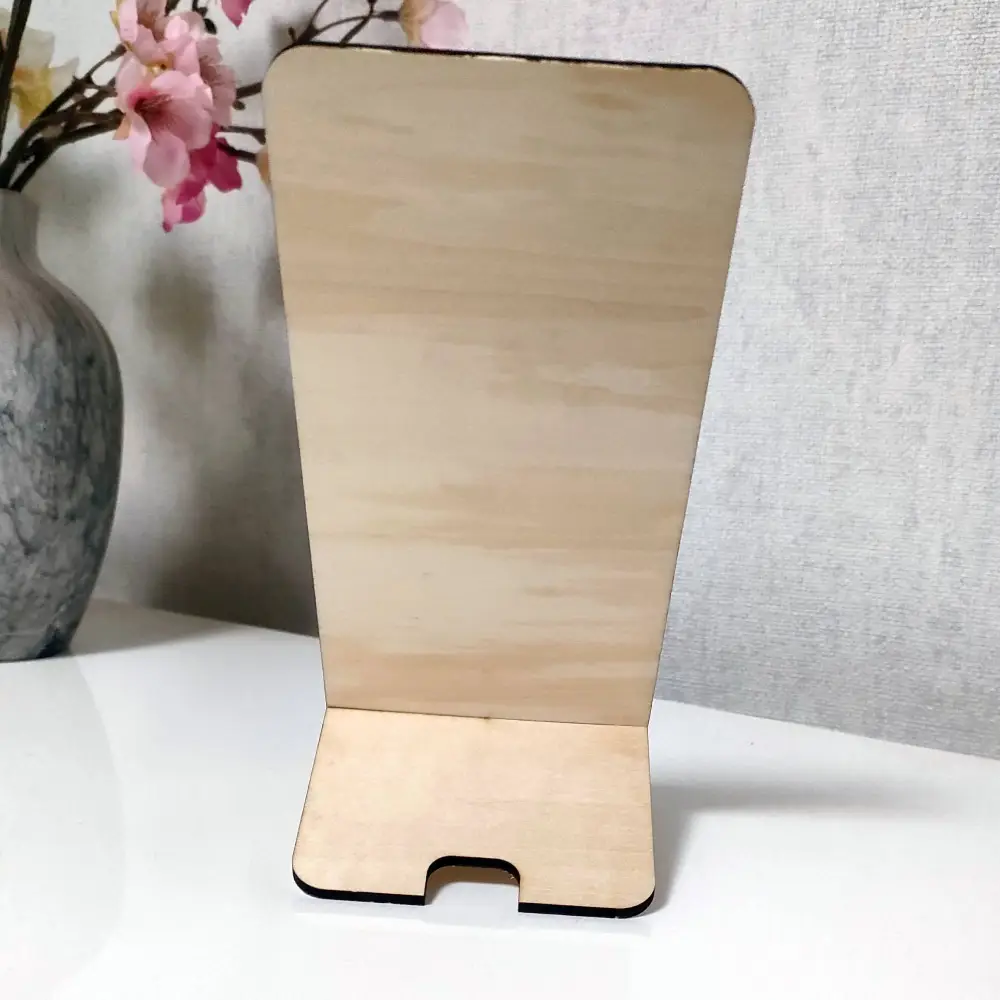 Apportez une touche chaleureuse et unique à votre bureau ou à votre intérieur avec ce support de téléphone portable en bois personnalisable, entièrement réalisé par gravure et découpe laser.