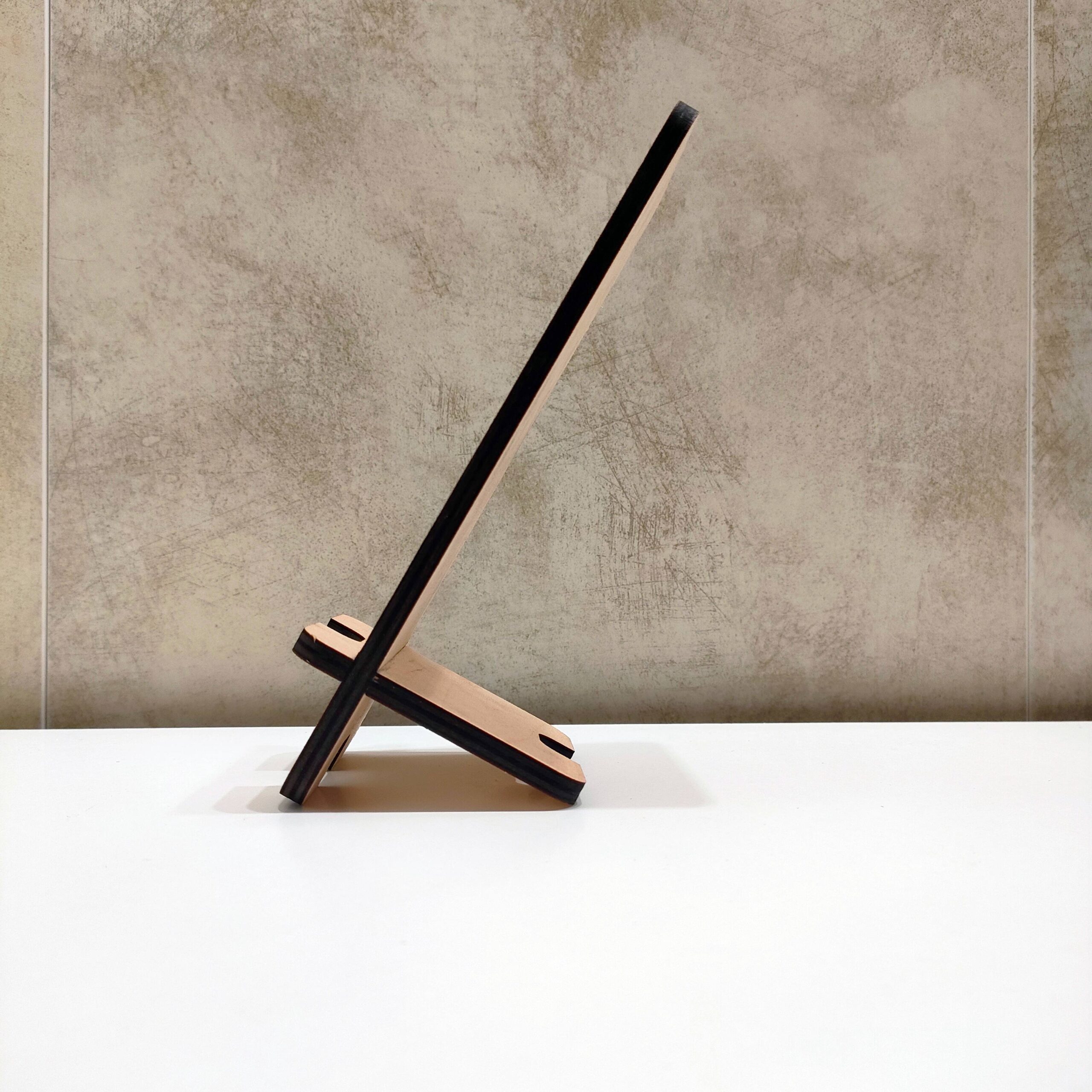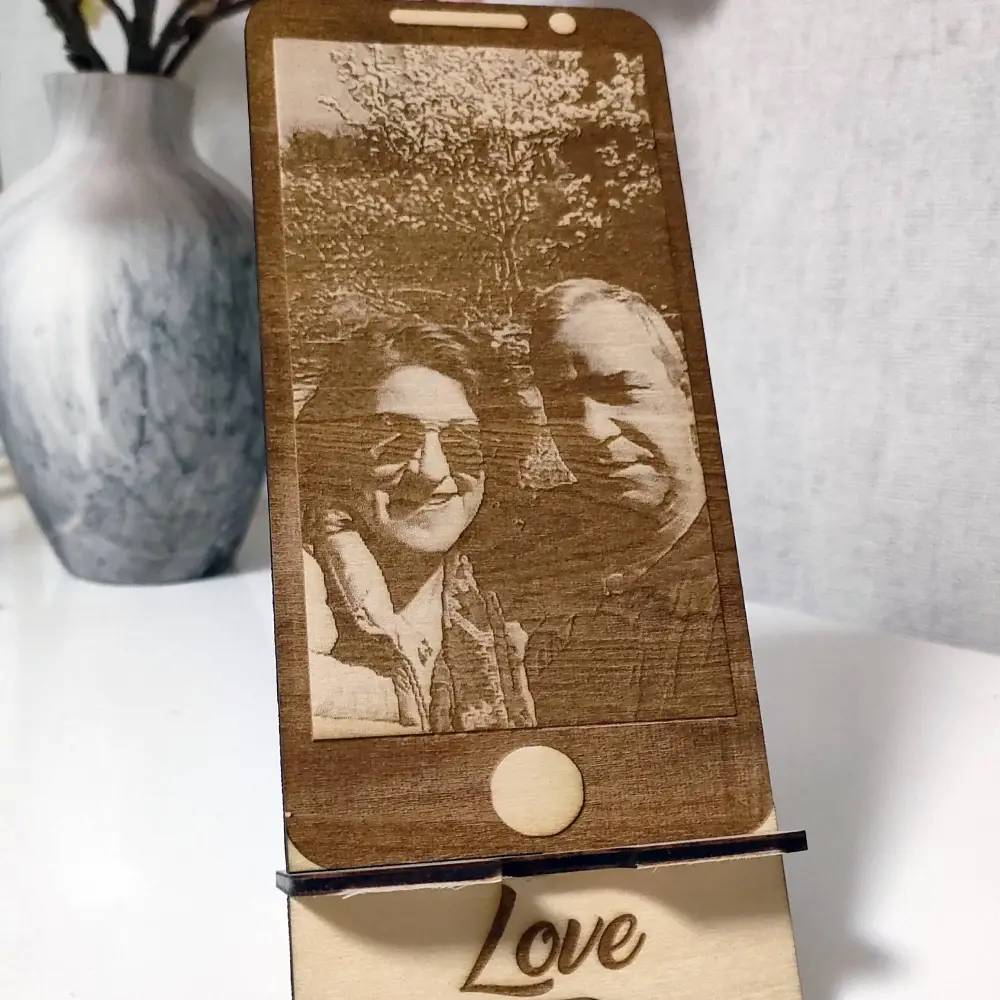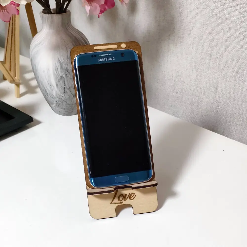 Apportez une touche chaleureuse et unique à votre bureau ou à votre intérieur avec ce support de téléphone portable en bois personnalisable, entièrement réalisé par gravure et découpe laser.