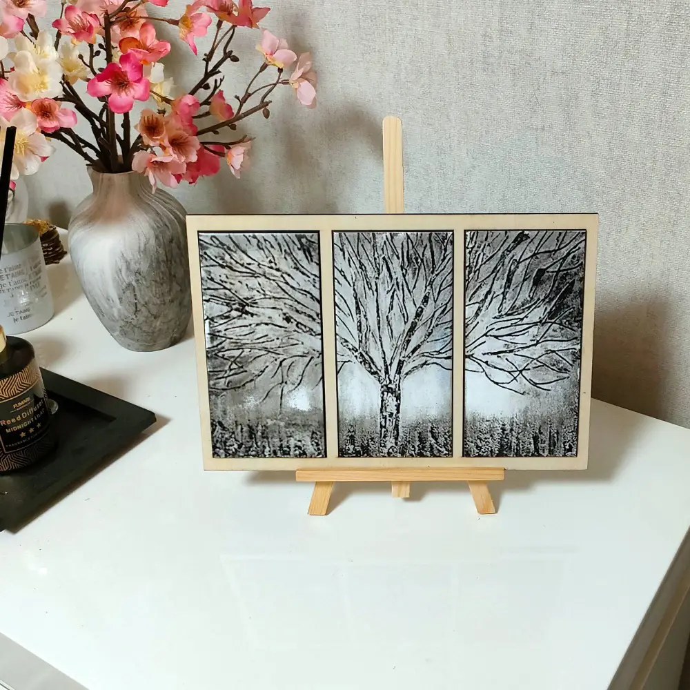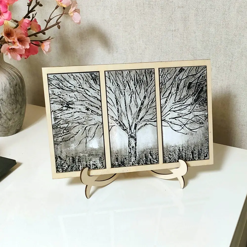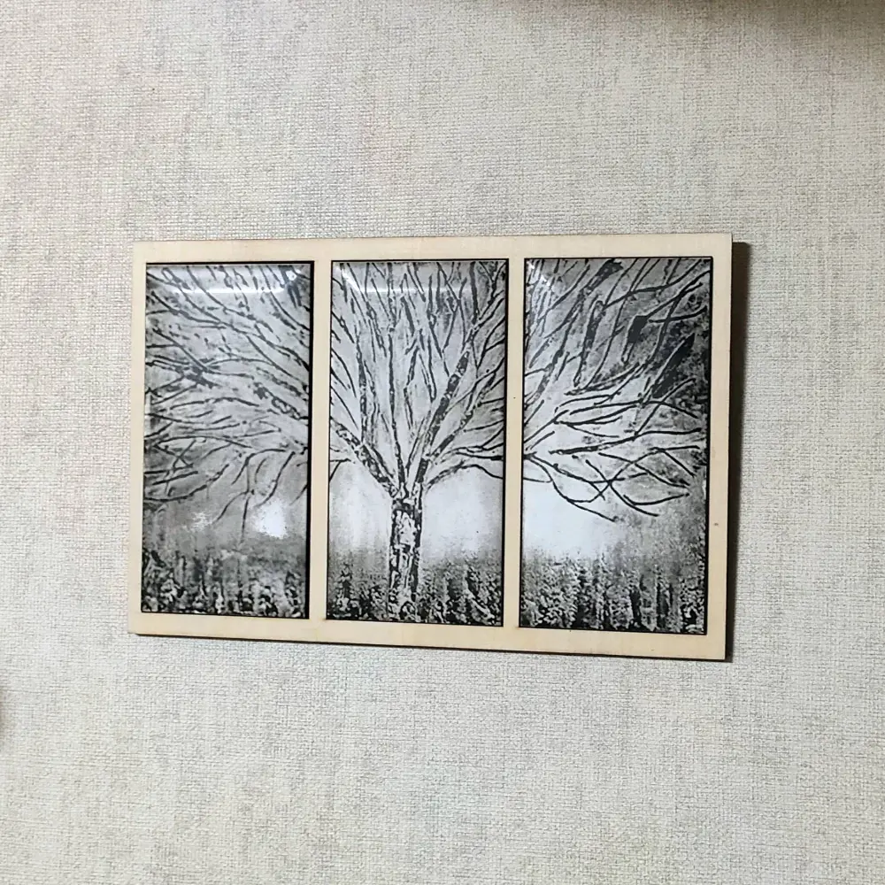 Chaque scène est gravée avec finesse pour révéler tous les détails du motif, ici un arbre hivernal épuré, offrant une décoration murale originale et intemporelle.