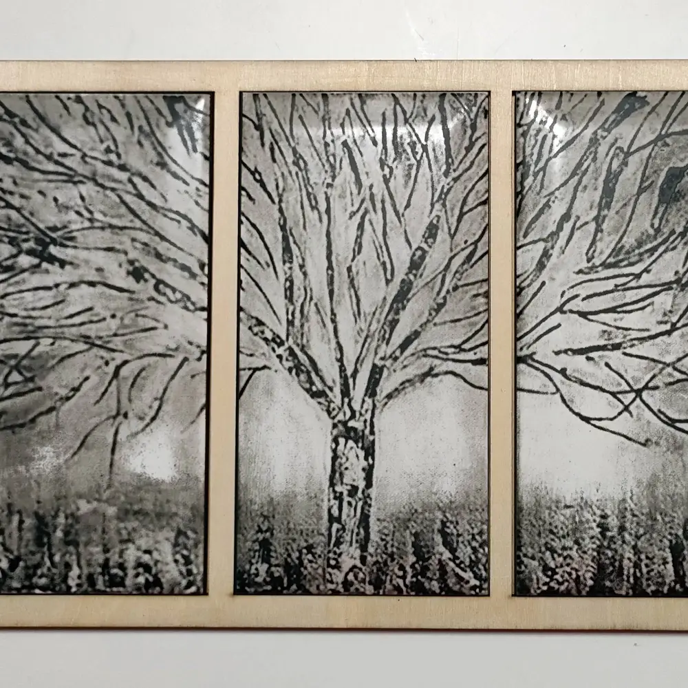 Apportez une touche d’élégance artisanale à votre intérieur avec ce magnifique triptyque mural composé de 3 carrelages gravés au laser, insérés dans un cadre en bois de tilleul fait sur mesure.